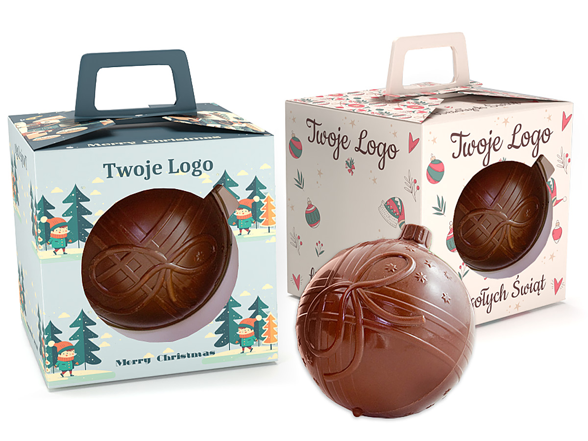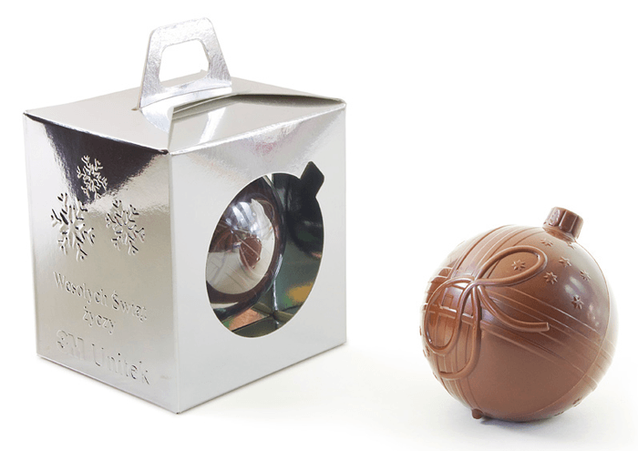 Bauble made of high-quality Belgian chocolate with ribbons molded on both sides.