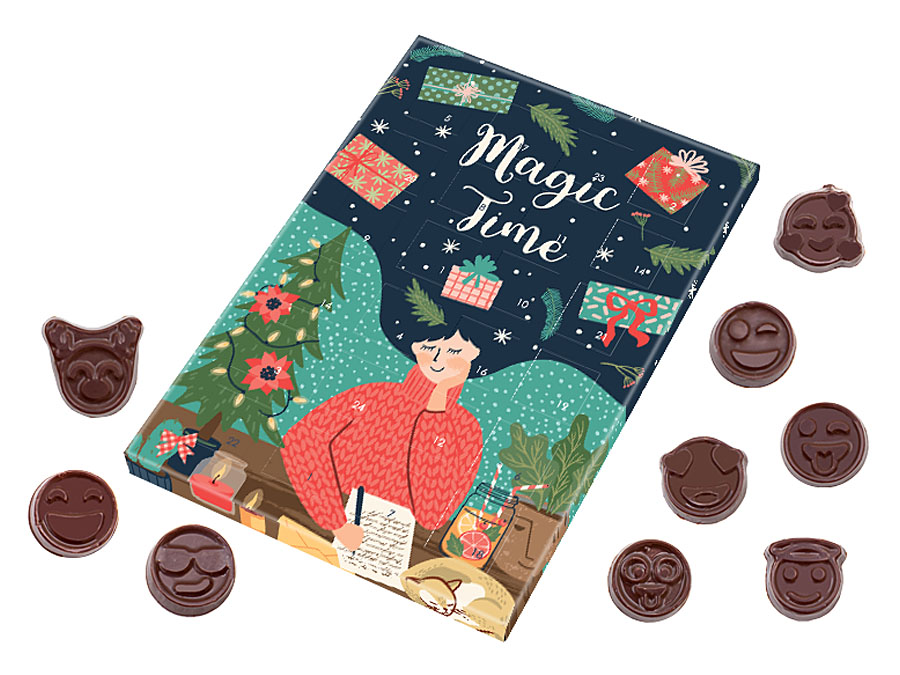 • cardboard box with with 24 small door for removal of individual chocolate pieces