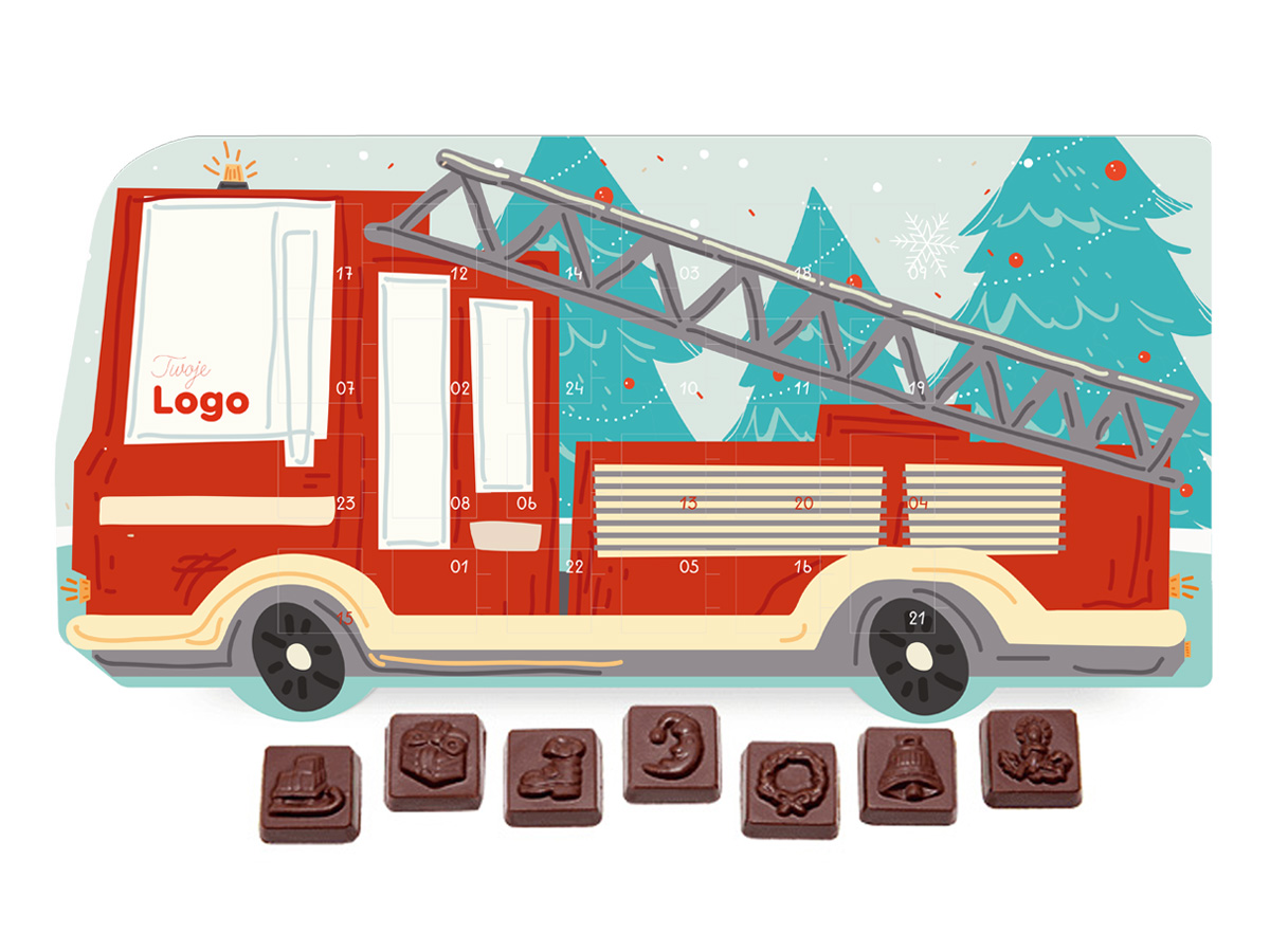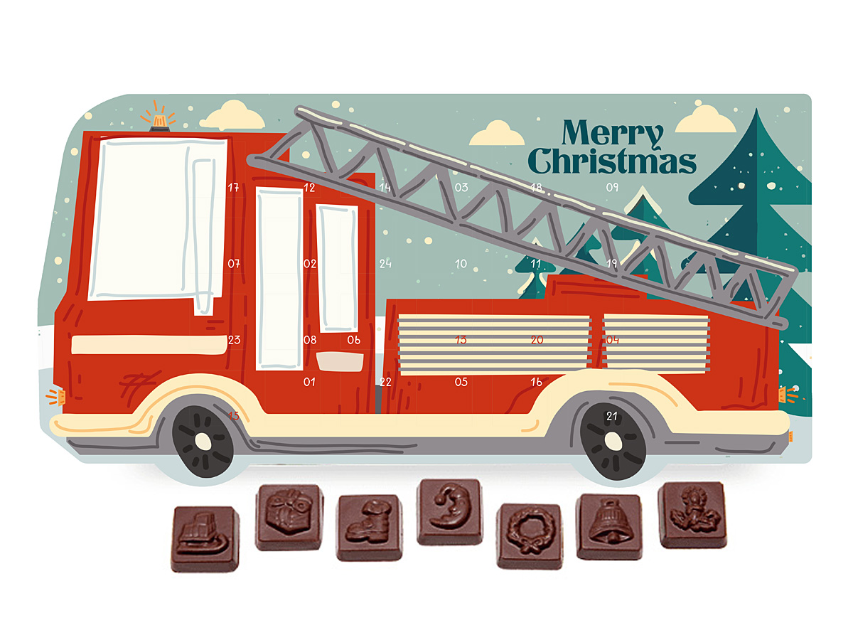 Fire truck shaped Advent calendar containing 24 rectangular chocolates with Christmas motifs embossed in each chocolate.