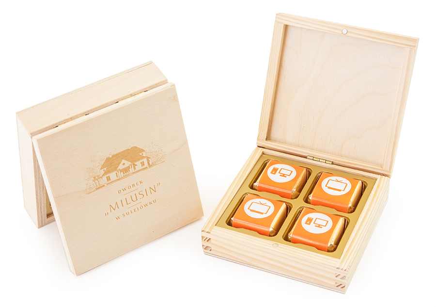 Set of 4 chocolates with delicate alcoholized cream filling wrapped in gold laminate and paper labels with promotional print.