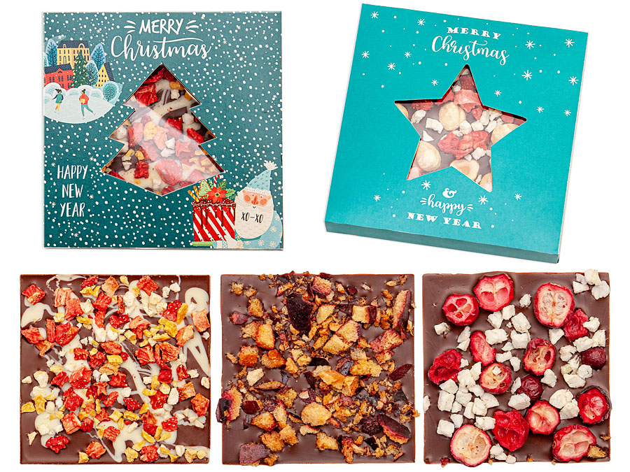 Excellent Belgian chocolate with various compositions of freeze-dried fruits.