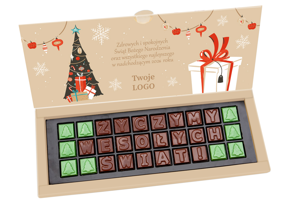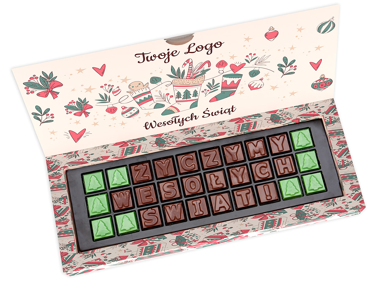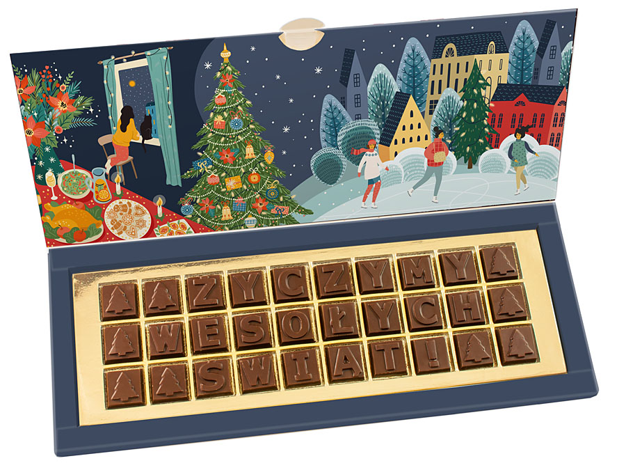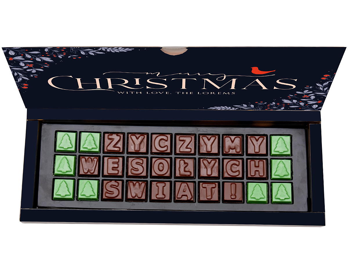 Seasonal greetings made of squares with letters and Christmas tree symbol, made of Belgian chocolate.