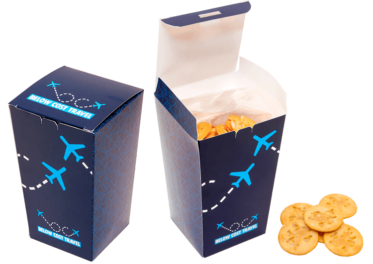 • cardboard box with CMYK or 1-4c Pantone promotional print