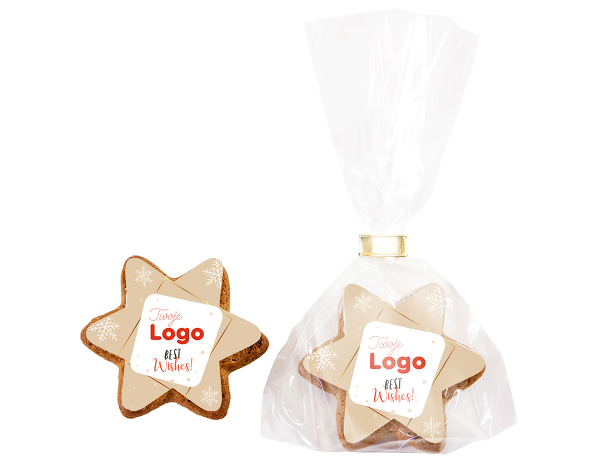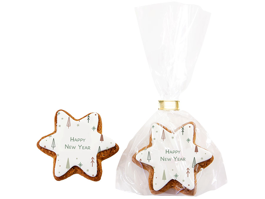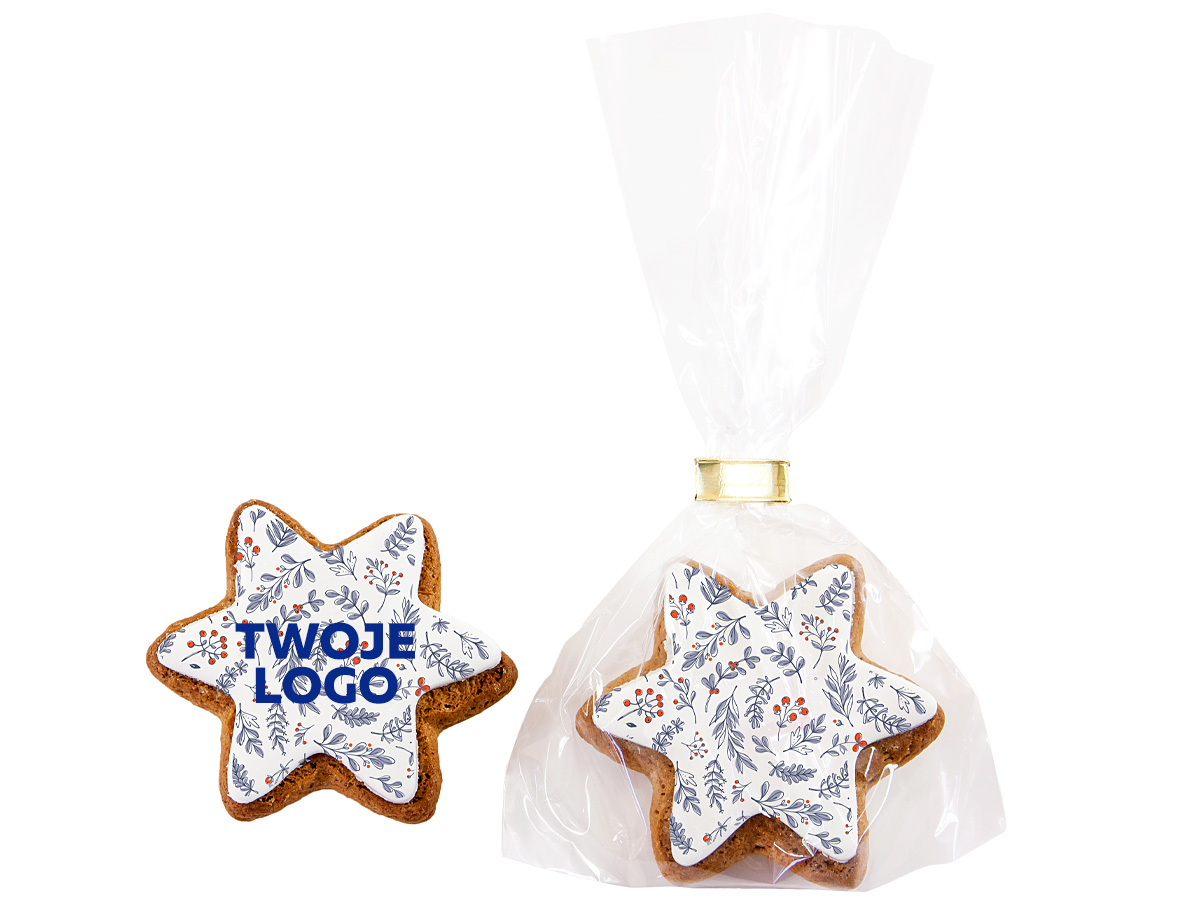 Star shaped, honey cookie covered with confectionery mass with promotional print.