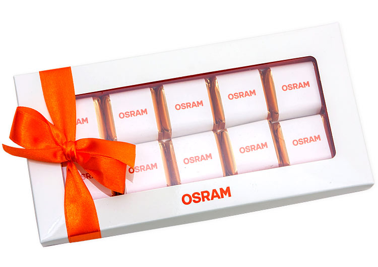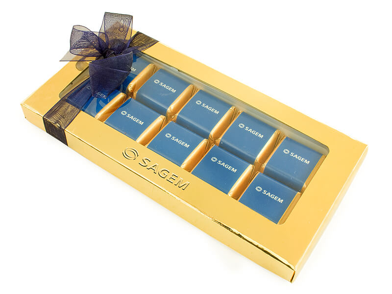 10 czekoladek z lekko alkoholizowanym nadzieniem zawinięte w złoty laminat oraz w wielobarwną obwolutę reklamową.