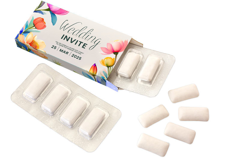 4 markowe gumy do żucia w kształcie drażetek pakowane w blistry.