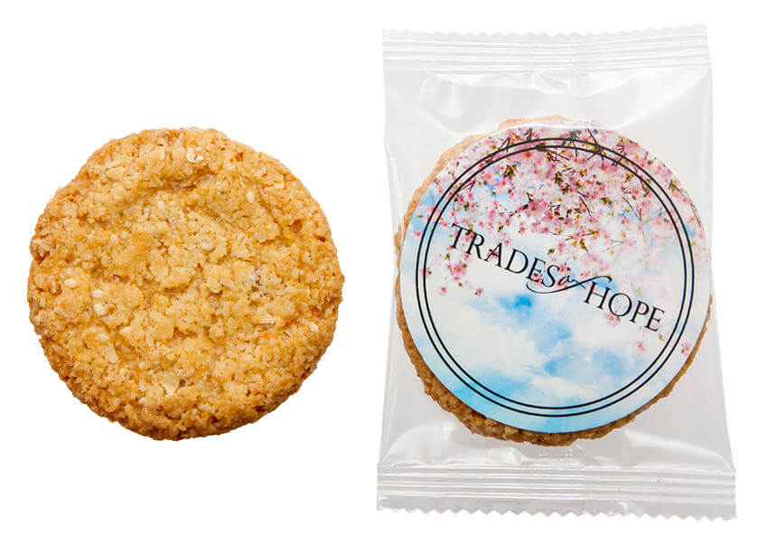 Kruche ciasteczka owsiane z dodatkiem sezamu, pakowane w przezroczyste saszetki foliowe typu flow-pack.