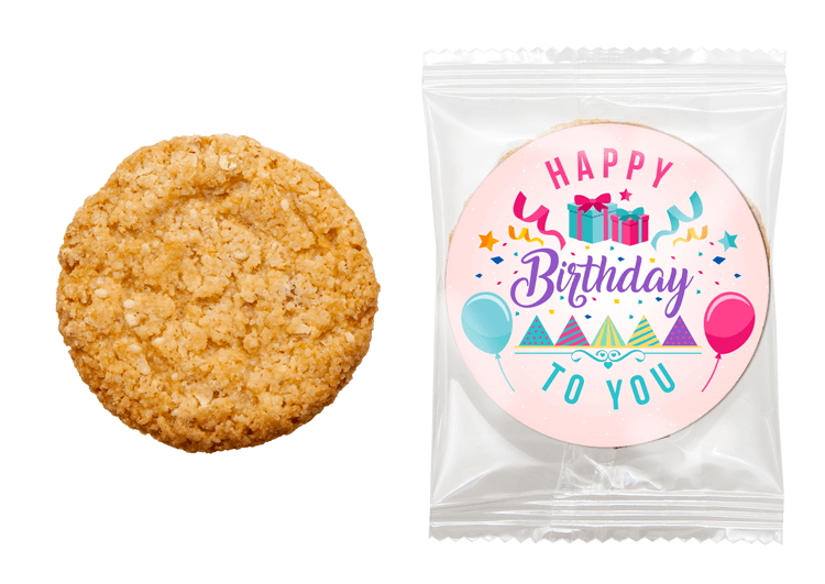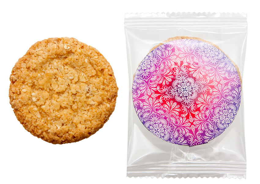 -okrągłe kartoniki po obudwu stronach ciasteczek z dowolnym nadrukiem reklamowym CMYK lub do 4 kolorów Pantone