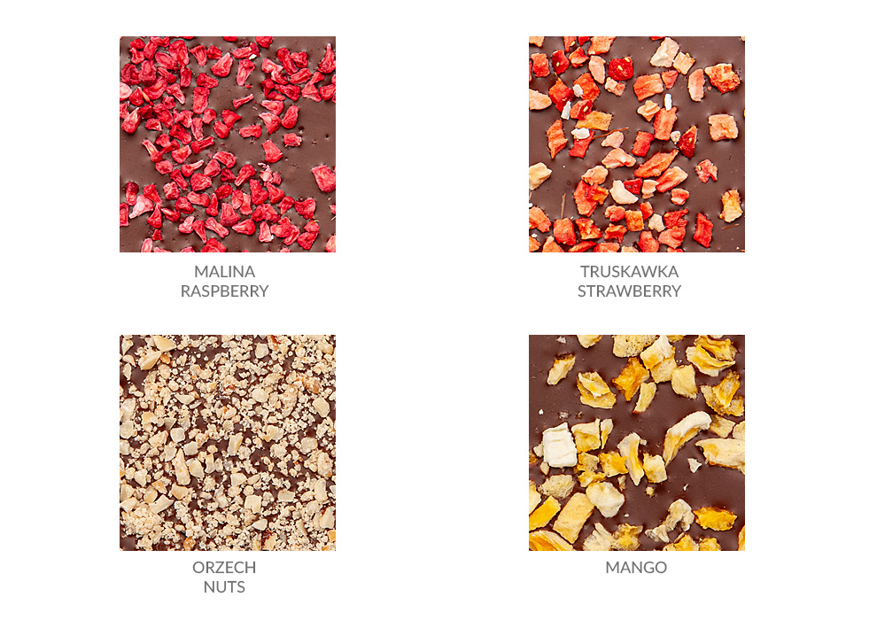 Duże czekolady w pudełkach kartonowych z zatopionymi owocami liofilizowanymi.