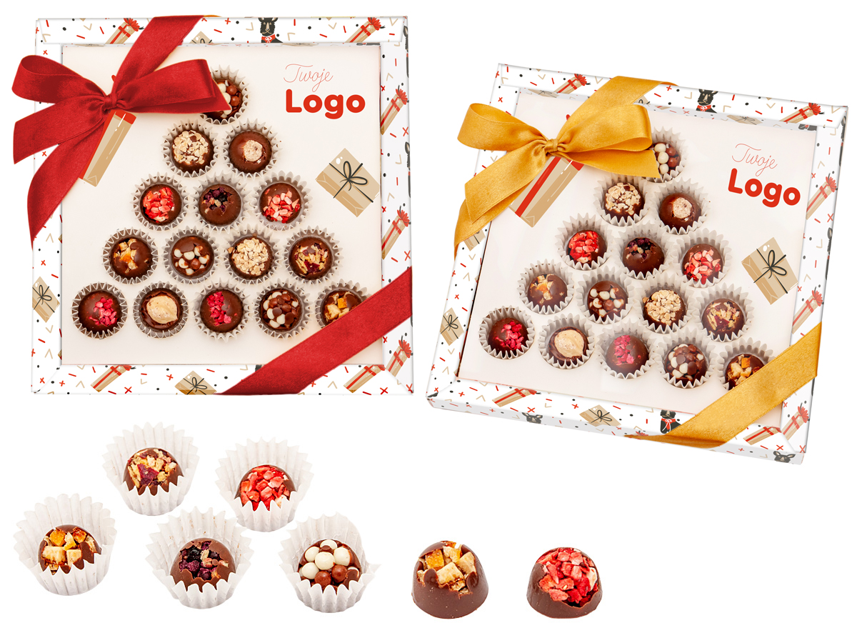 • 15 wyśmienitych czekoladek wykonanych z czekolady mlecznej 44% ozdobione różnymi owocami liofilizowanymi, posypkami czekoladowymi i orzechami