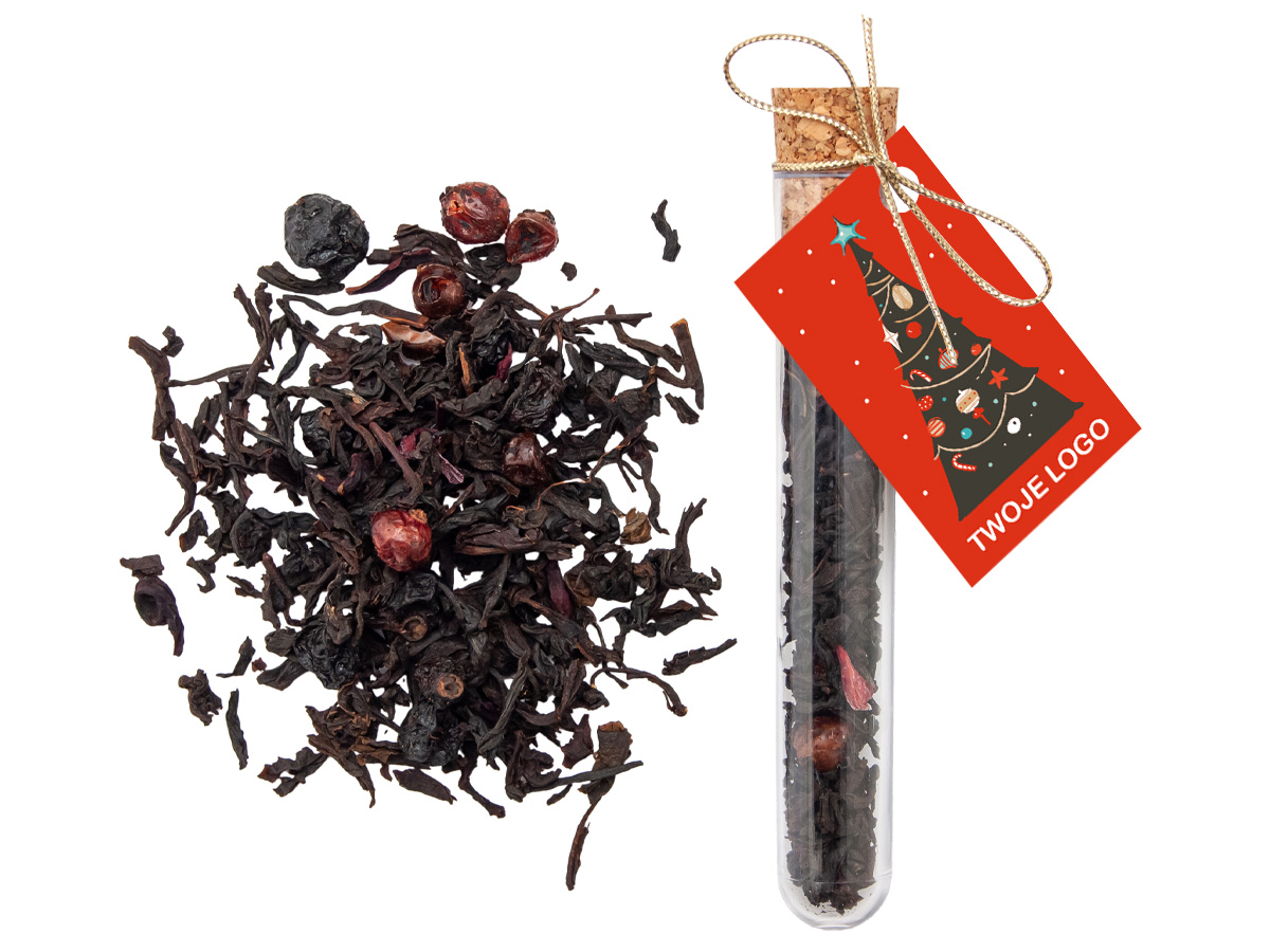 Podarunek składający się z fiolki wypełnionej liściastą herbatą