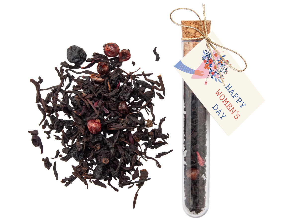 Podarunek składający się z fiolki wypełnionej liściastą herbatą
