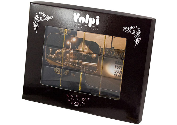 Zestaw puzzli składający się z 12 oryginalnych czekoladek belgijskich zawiniętych w złoty lub srebrny laminat oraz wielobarwne obwoluty reklamowe.