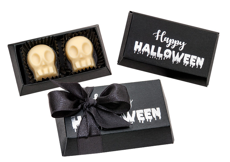 • dwie intrygujące czekoladki w kształcie czaszek ułożonych w kartonowym opakowanie w kształcie trumny