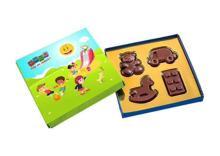 Zestaw 4 czekoladek o kształtach nawiązujących do świata dzieci.