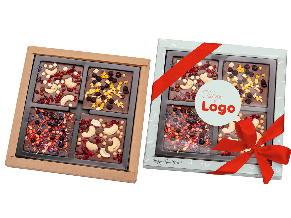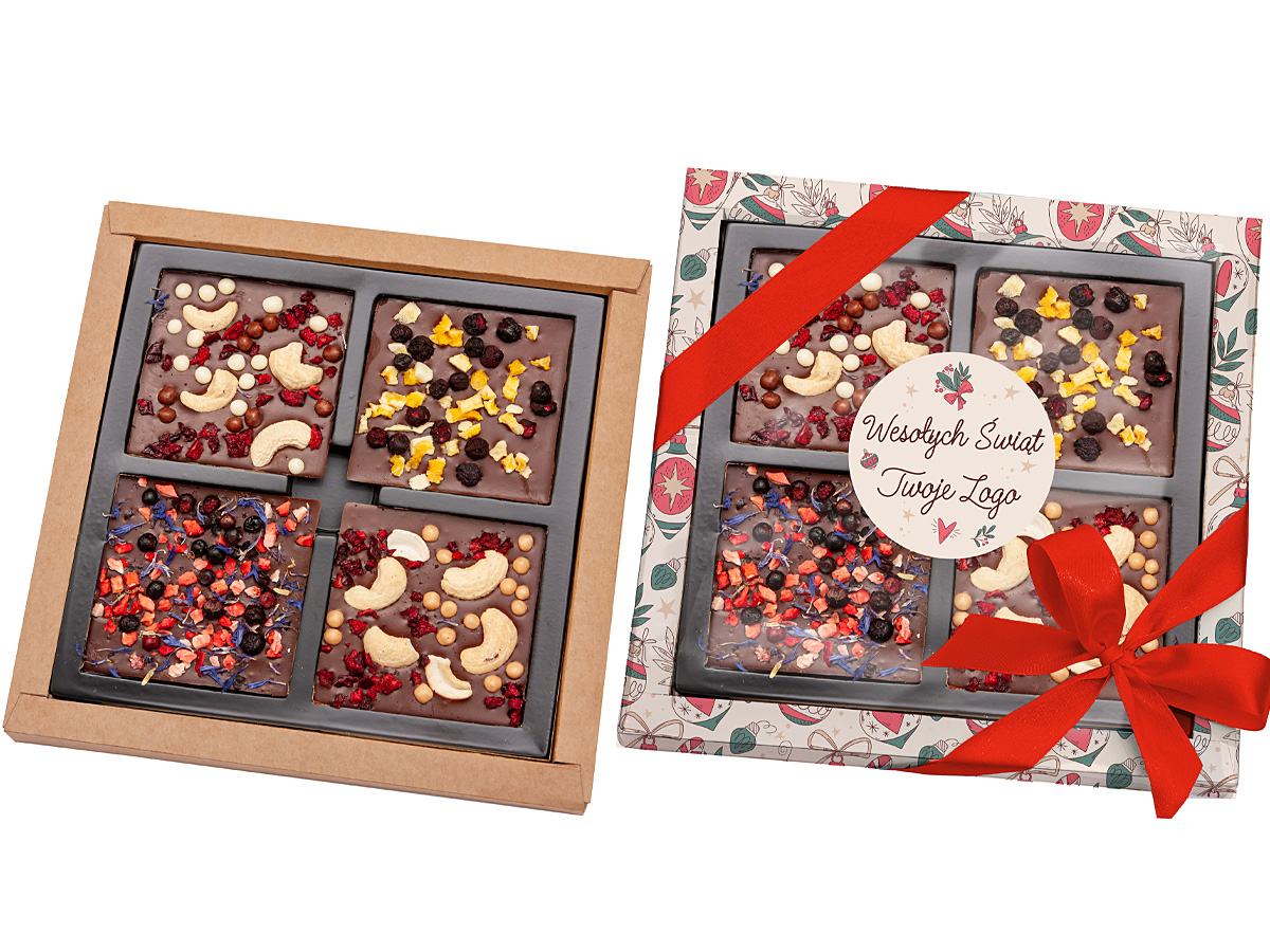 4 wyśmienite czekoladki wykonane z czekolady mlecznej 44% ozdobione różnymi owocami liofilizowanymi, posypkami czekoladowymi i orzechami